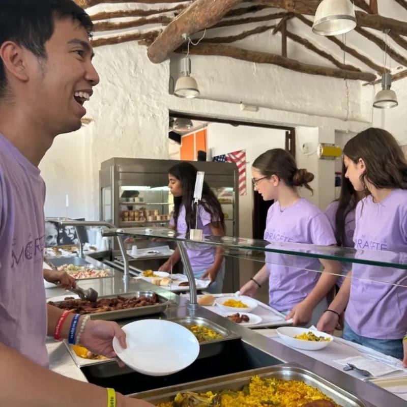 El menú consiste en comida casera y de calidad, con productos frescos y de proximidad, que se sirve recién hecha gracias a la cocina propia del campamento.
