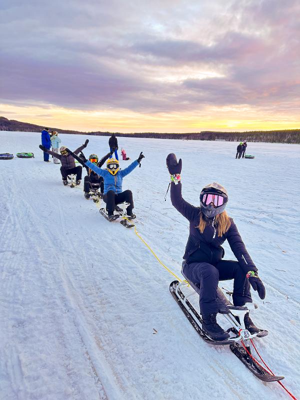 Agárrate a una cuerda y déjate arrastrar por una moto de nieve. La velocidad te hará sentir la adrenalina y la nieve fresca y el viento te picarán en la cara. ¡Esta actividad te hará sentir como un niño! Con un trineo, una rueda o unos esquís, te arrastrarán por el lago a una velocidad adecuada, mientras disfrutas de una hoguera en el lago con un delicioso almuerzo y una taza de café o chocolate caliente.