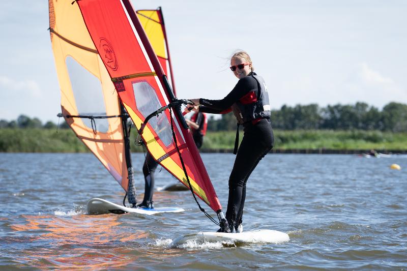Además de la vela, en el campamento también se pueden practicar otros deportes acuáticos, como el windsurf. El lago no es muy profundo, lo que facilita la práctica de este deporte. Los windsurfistas más avanzados también pueden disfrutar aquí, por ejemplo, practicando el beach start y el water start. Nosotros nos encargamos de todo el material, ¡así que no tienes que preocuparte por nada!
