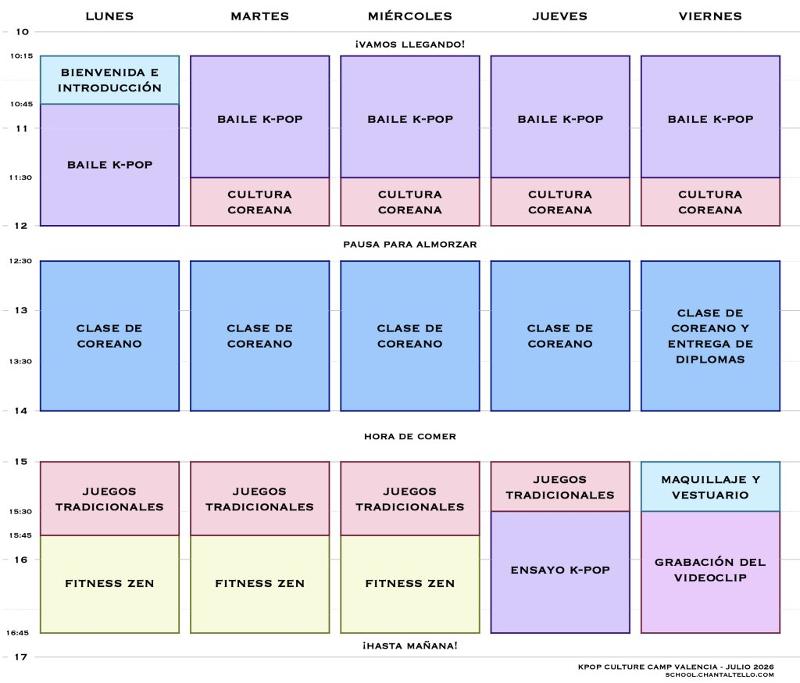 Además del baile, el campamento incluye iniciación al idioma coreano, donde los alumnos aprenden Hangul (el alfabeto coreano) y expresiones básicas, así como talleres culturales para descubrir tradiciones, juegos y aspectos clave de Corea del Sur.