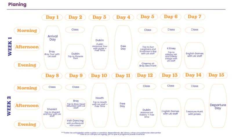 En este viaje lingüístico de 15 días, más allá de sumergirnos en la cultura y el idioma las 24 horas del día, tendremos 30 horas de clases adaptadas a niveles básico, intermedio o avanzado, realizando un test de nivel el primer día, para que la experiencia y el aprendizaje sea lo más positivo posible. También podrás participar en clubs de conversación diaria después de las clases. Dispondrás de los libros de texto, un diario para el estudiante y el certificado de asistencia al finalizar las clases.