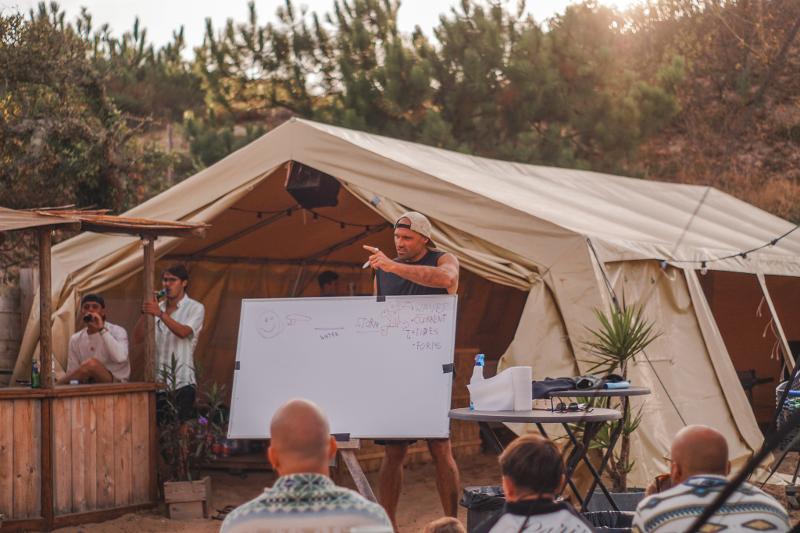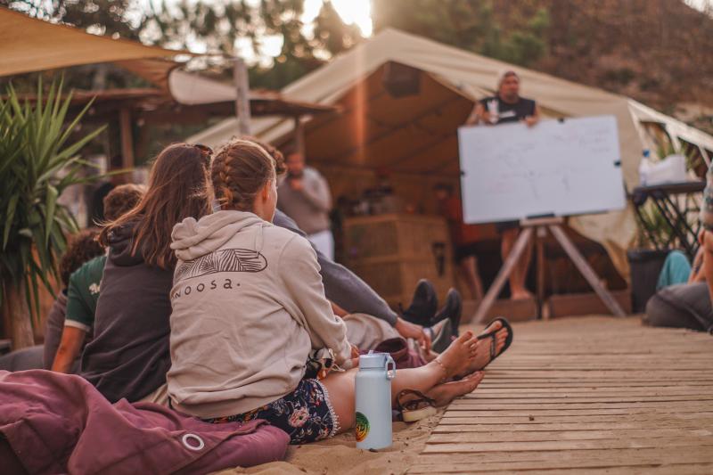 Durante tu semana de surf en el campamento internacional de surf, recibirás una clase teórica de surf muy completa. Esta interesante clase está repleta de información útil sobre corrientes, olas, mareas y seguridad general. Se tratan todos los temas teóricos para que estés bien preparado durante una semana llena de océano y surf, todo ello mientras disfrutas de una cerveza bien fría.